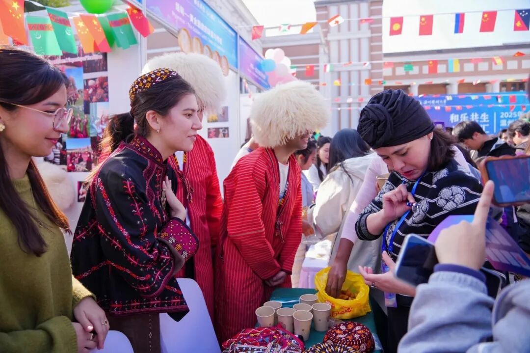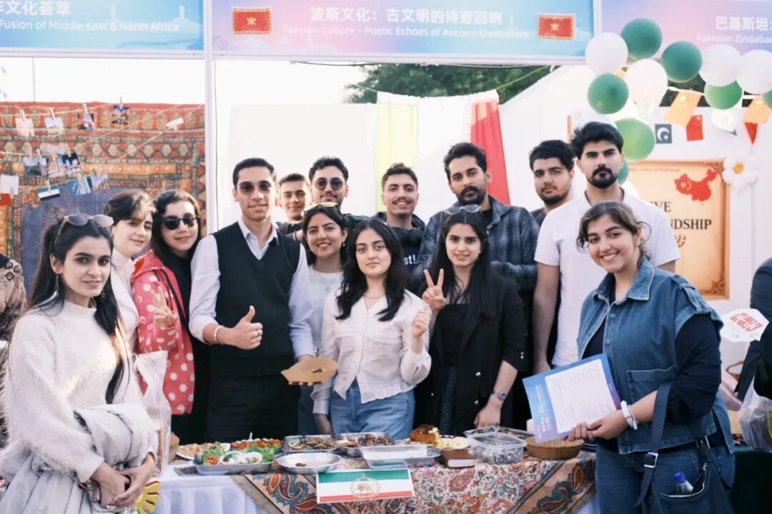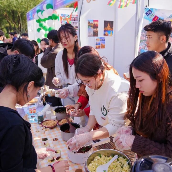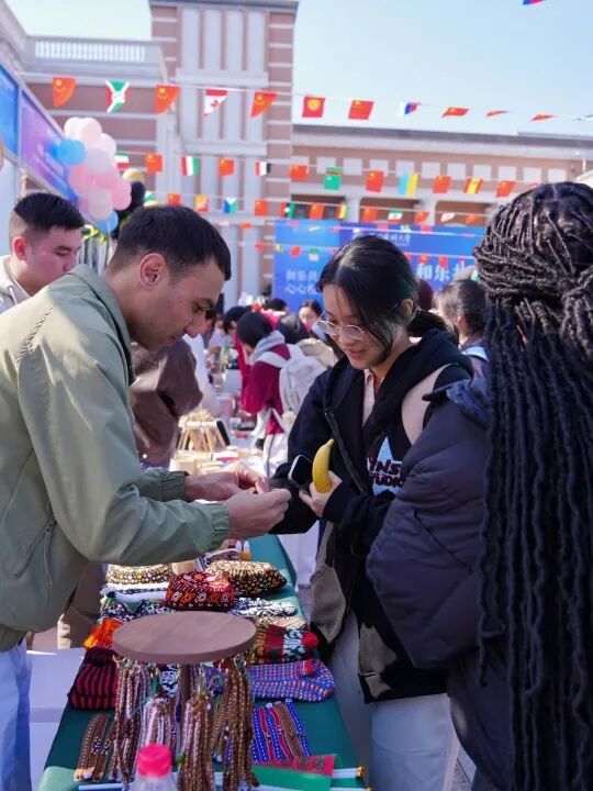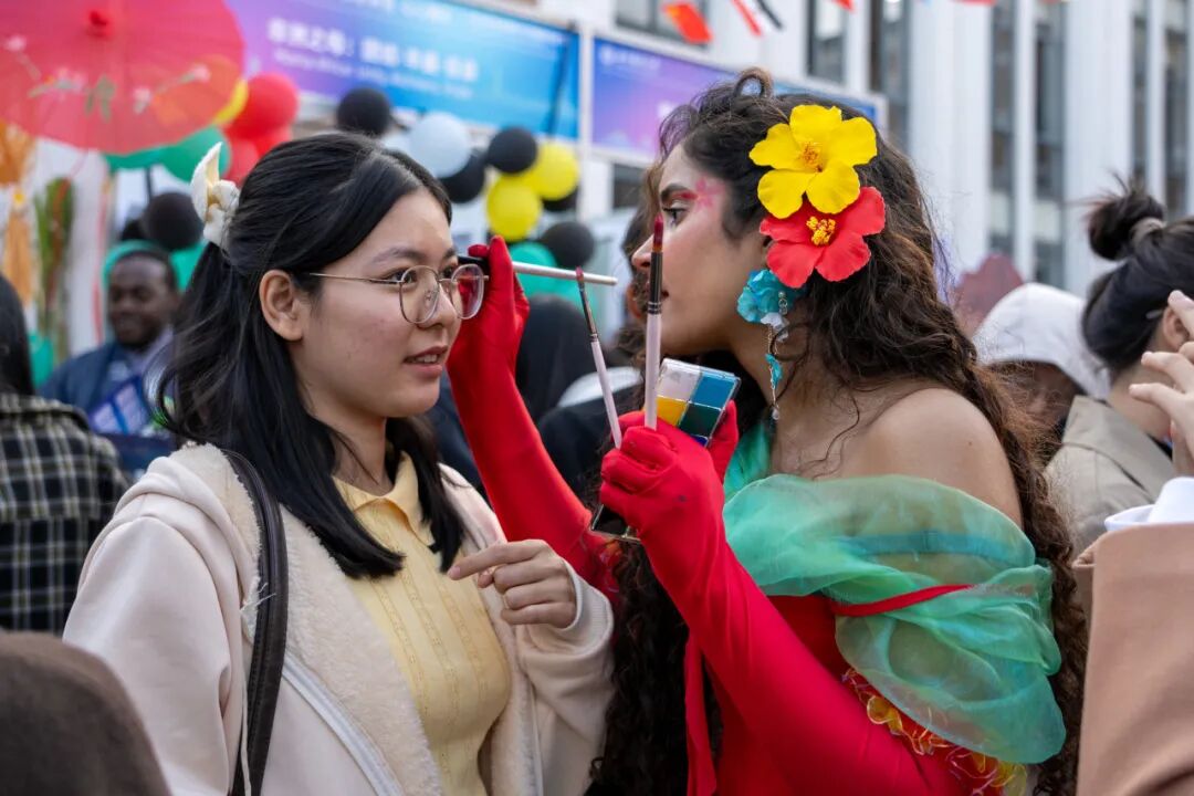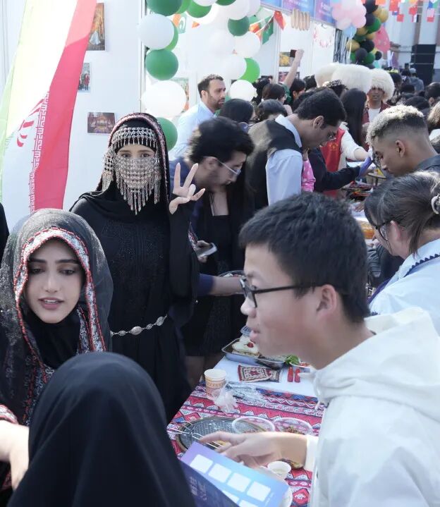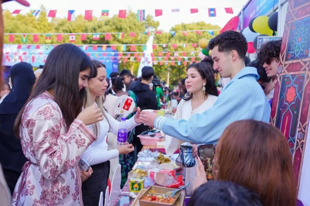国际文化展区前排起了长队,成为现场打卡热门点。来自摩洛哥、塞内加尔、坦桑尼亚、牙买加、不丹、缅甸、土库曼斯坦、巴基斯坦、伊朗、也门等数十个国家的留学生,化身本国文化“代言人”,带来极具地域特色的展示。牙买加展位的雷鬼音乐动感十足;缅甸特色美食让人垂涎欲滴;不丹的香品体验区香气清雅;巴基斯坦的汉娜艺术以精美花纹吸引众多同学体验;波斯传统服饰展演则凭借华丽服饰与优美姿态……